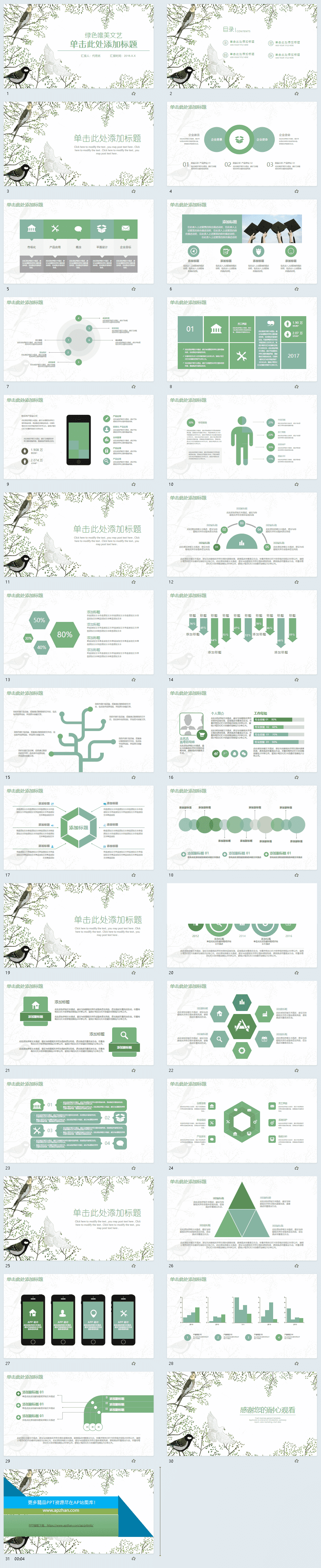 清新文艺范小鸟PPT模板。一套文艺小清新幻灯片模板,页面类型丰富,清新绿色主色调,树枝小鸟背景。